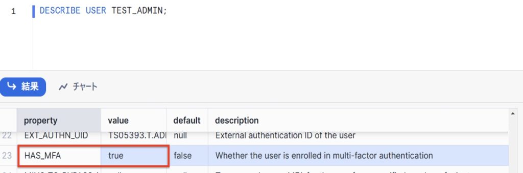 HAS_MFA項目のvalue列がtrueになっていれば多要素認証が設定されている。