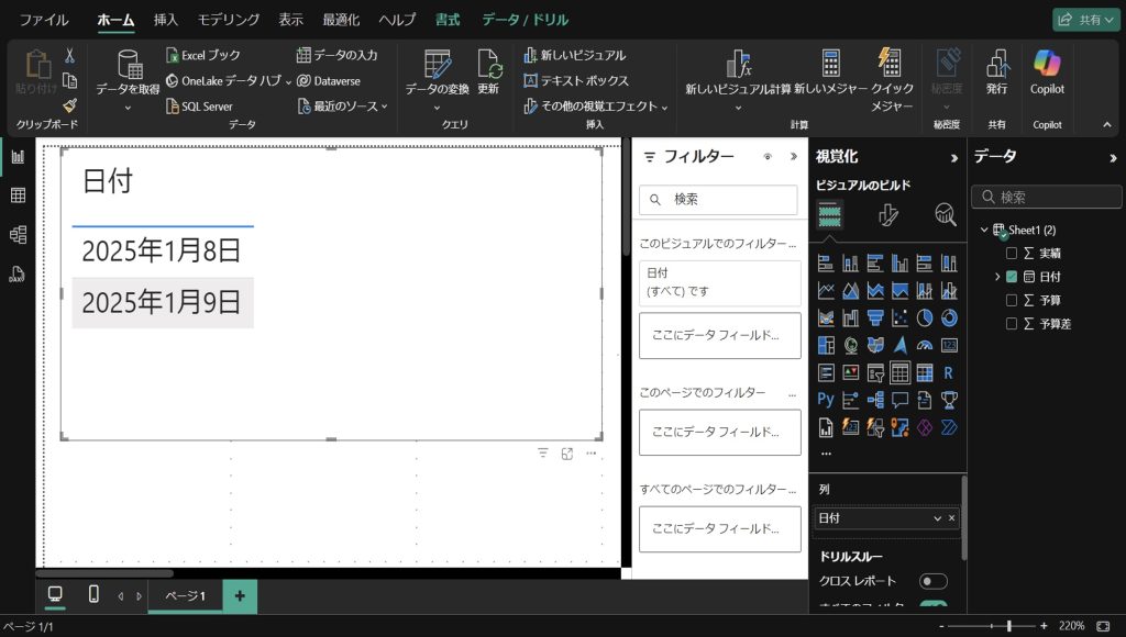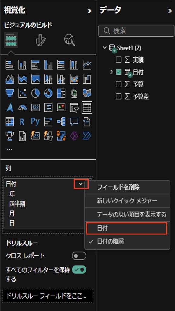 ②視覚化 > 列 > 日付の「v」をクリック