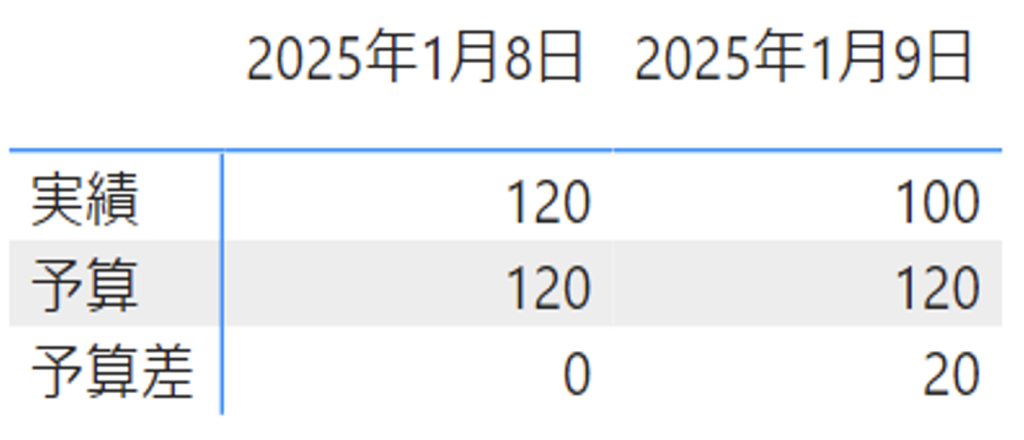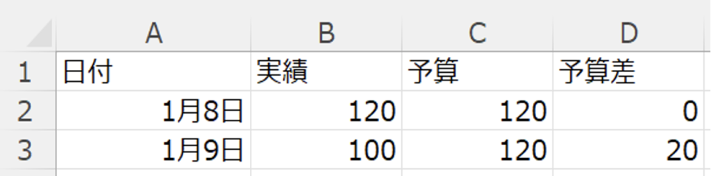 今回の検証で使うのは以下のように、実績、予算、予算差といったデータを列ごとに持っているデータ