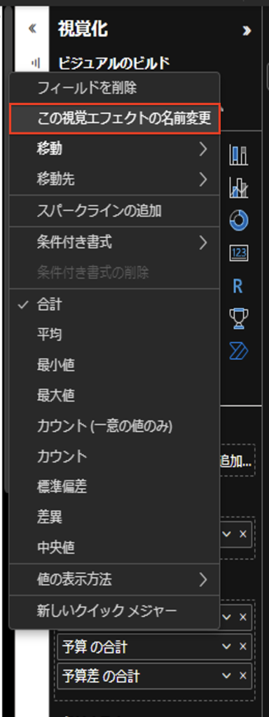 ⑥視覚化>ビジュアルにデータを追加する>値>名前を変更したい値のvマーク