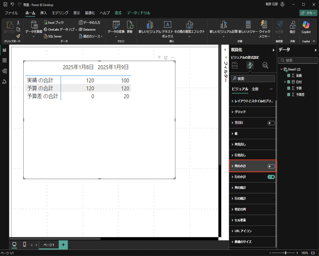⑤視覚化>ビジュアルの書式設定>列の小計のラジオボタンをオフにする