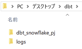 また、dbt initコマンドを実行したフォルダは以下にはdbtのプロジェクトフォルダが作成されます。